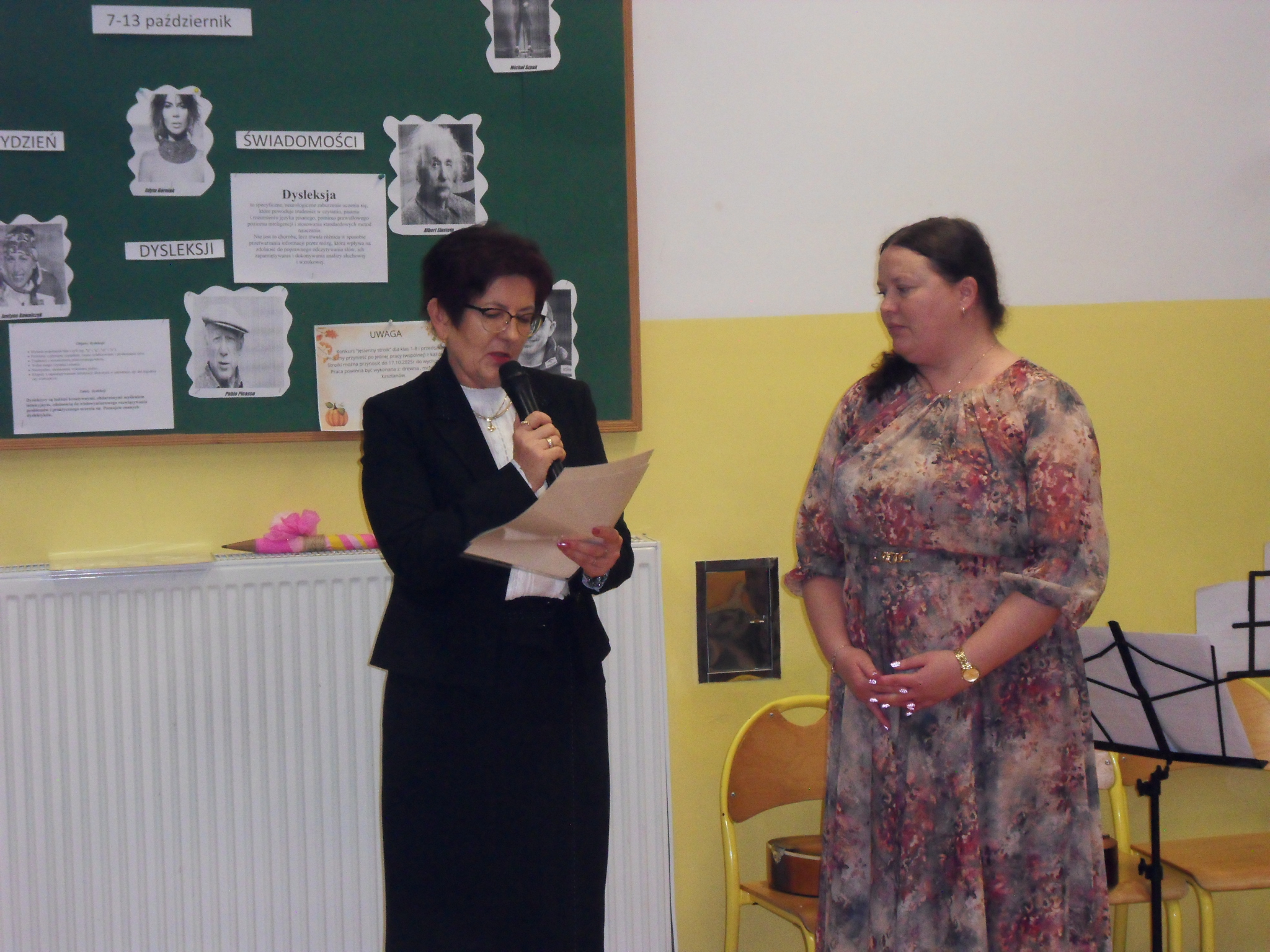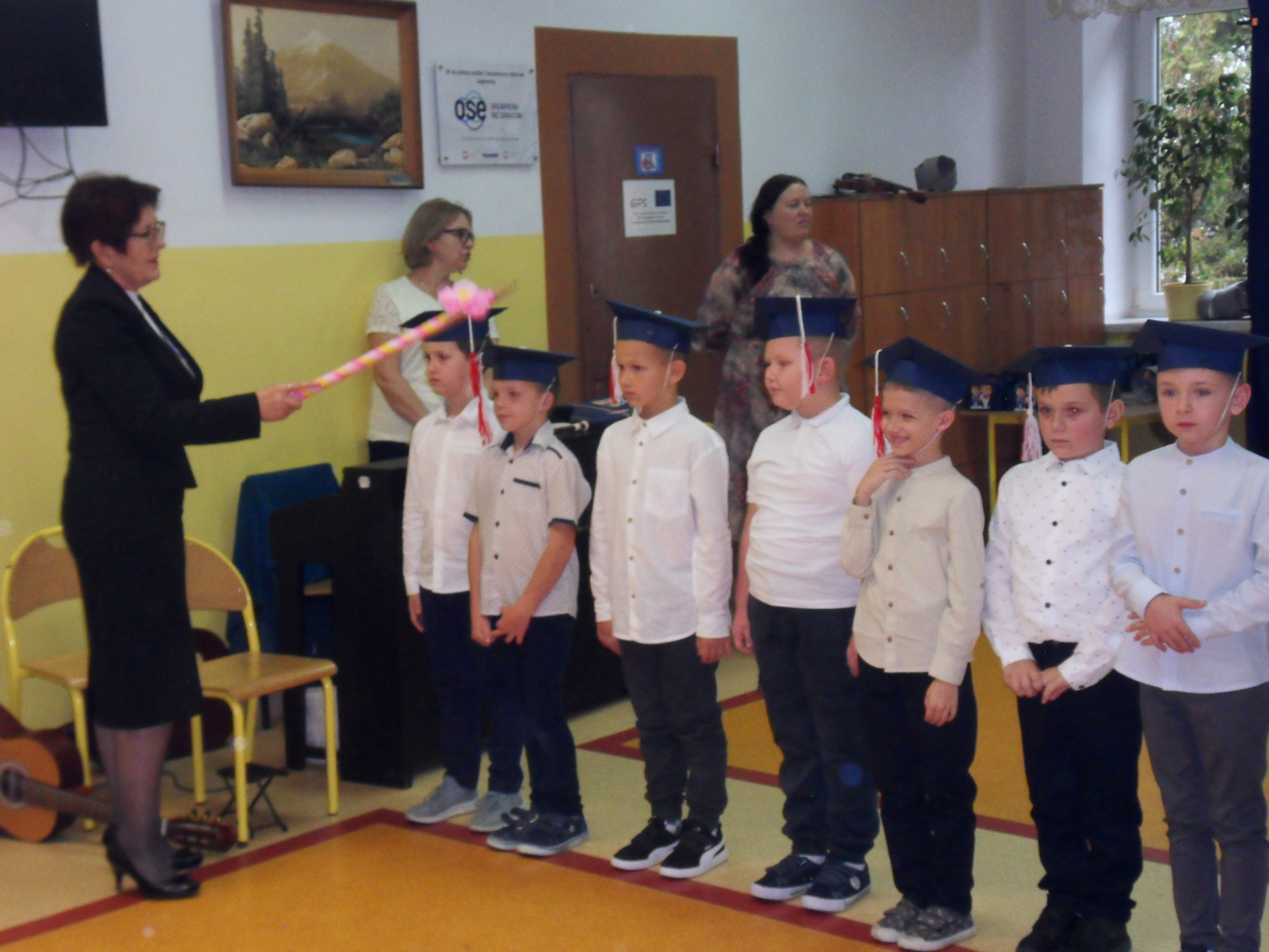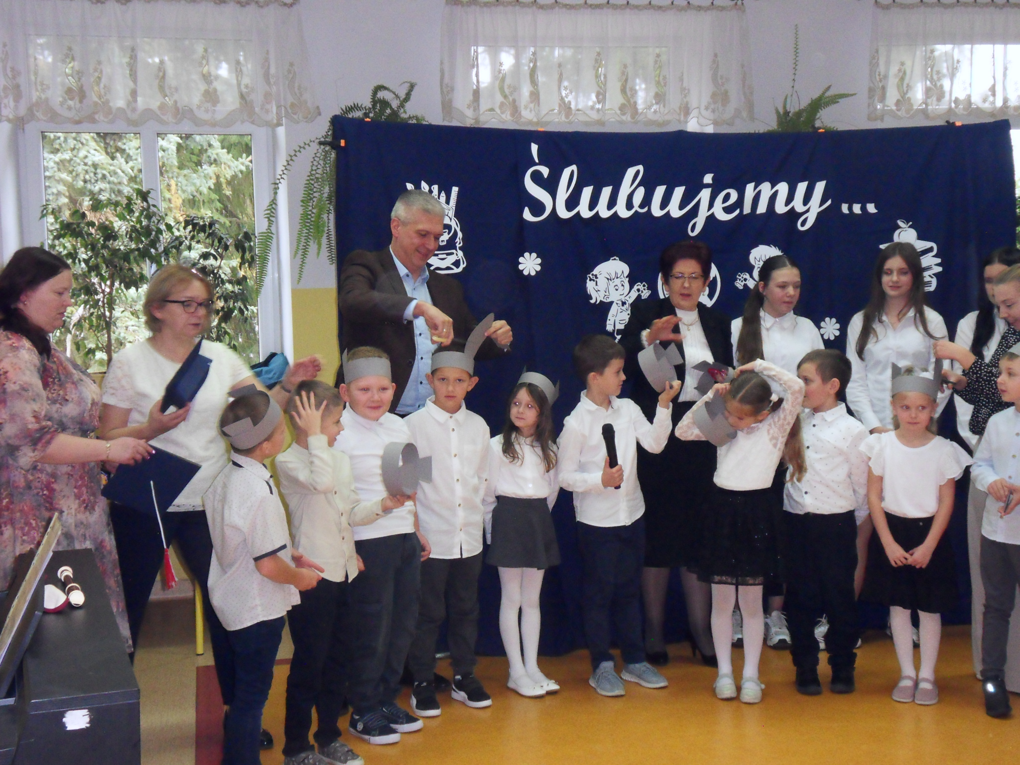 Punktem kulminacyjnym uroczystości było ślubowanie. Pierwszoklasiści złożyli przyrzeczenie, że będą godnie reprezentować swoją szkołę i dbać o jej dobre imię. Pani dyr. Renata Kilian złożyła życzenia uczniom, rodzicom i pracownikom szkoły, wręczyła nagrody z okazji DEN oraz dokonała aktu pasowania pierwszoklasistów. Całe wydarzenie uświetnił występ szkolnego chóru „Szpaczki”, działającego pod kierunkiem Pani Grażyny Papierz. Wszystkim uczestnikom uroczystości dopisywały świetne humory.