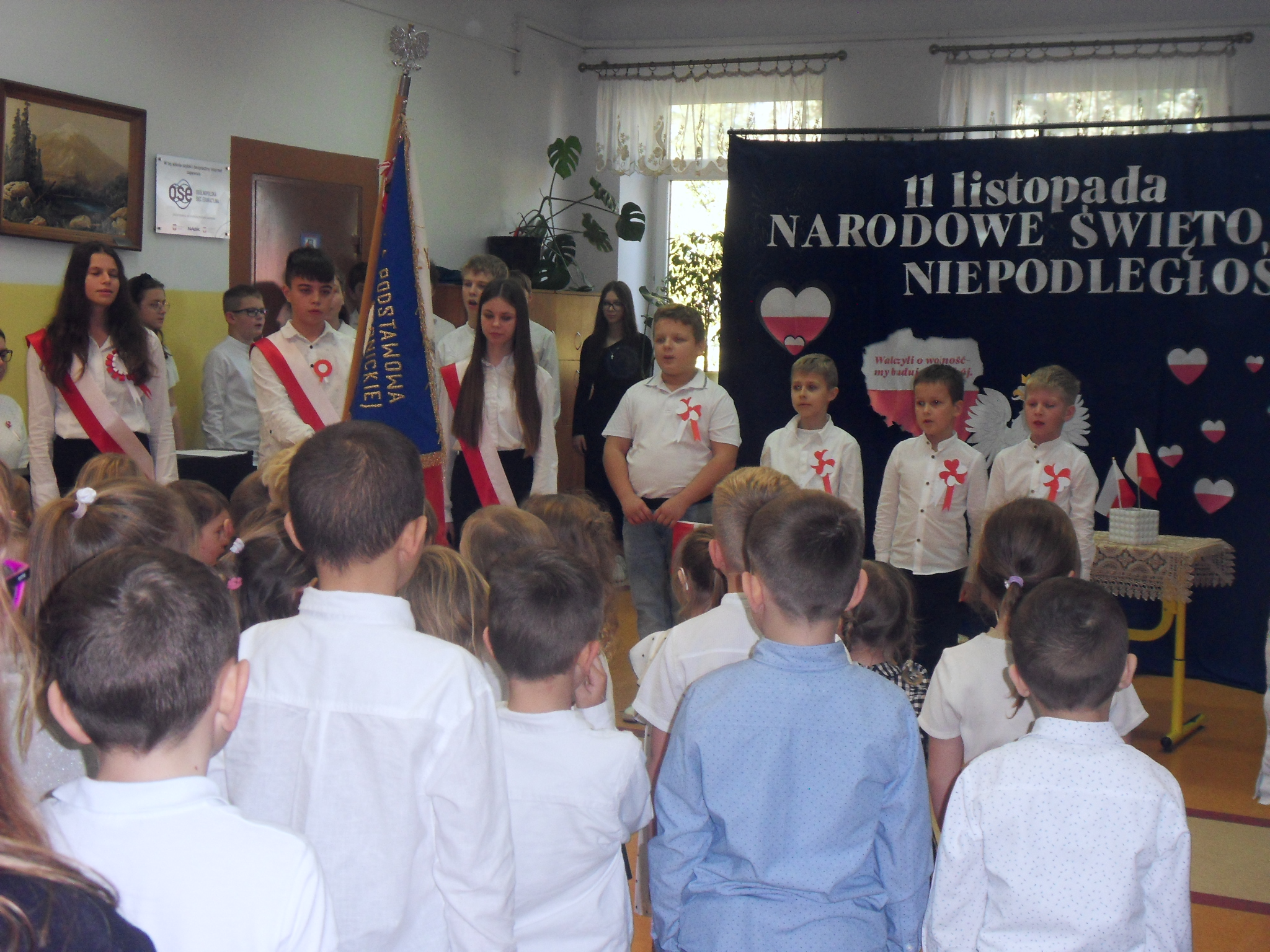 Szkolny chór „Szpaczki” zaprezentował się w koncercie patriotycznym „Pieśni dla Polski”, który odbył się w auli Szkoły Podstawowej w Poniatowej. Poczet sztandarowy naszej szkoły uczestniczył we mszy św. za Ojczyznę w kościele w Poniatowej.