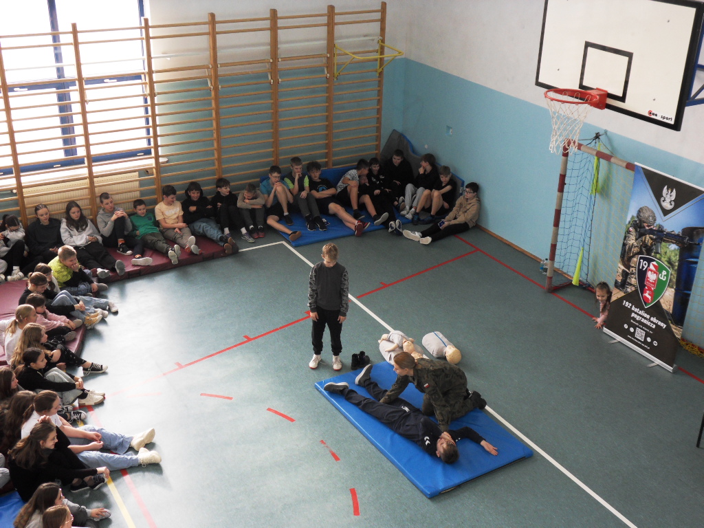 Wojskowi omówili zagadnienia związane z pierwszą pomocą oraz przygotowaniami na wypadek sytuacji kryzysowych, takich jak: powódź, wichura, działania wojenne. Wszyscy słuchacze przypomnieli sobie, co powinien zawierać plecak ewakuacyjny.